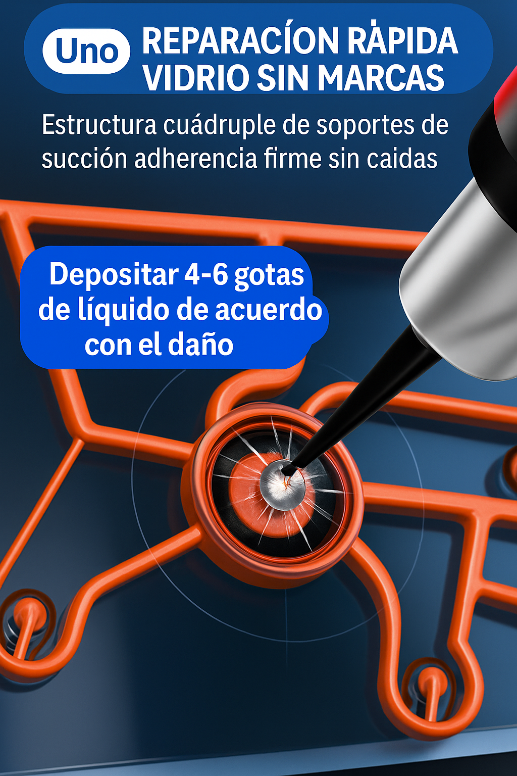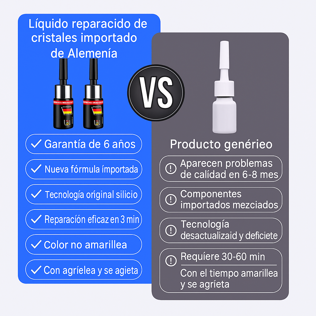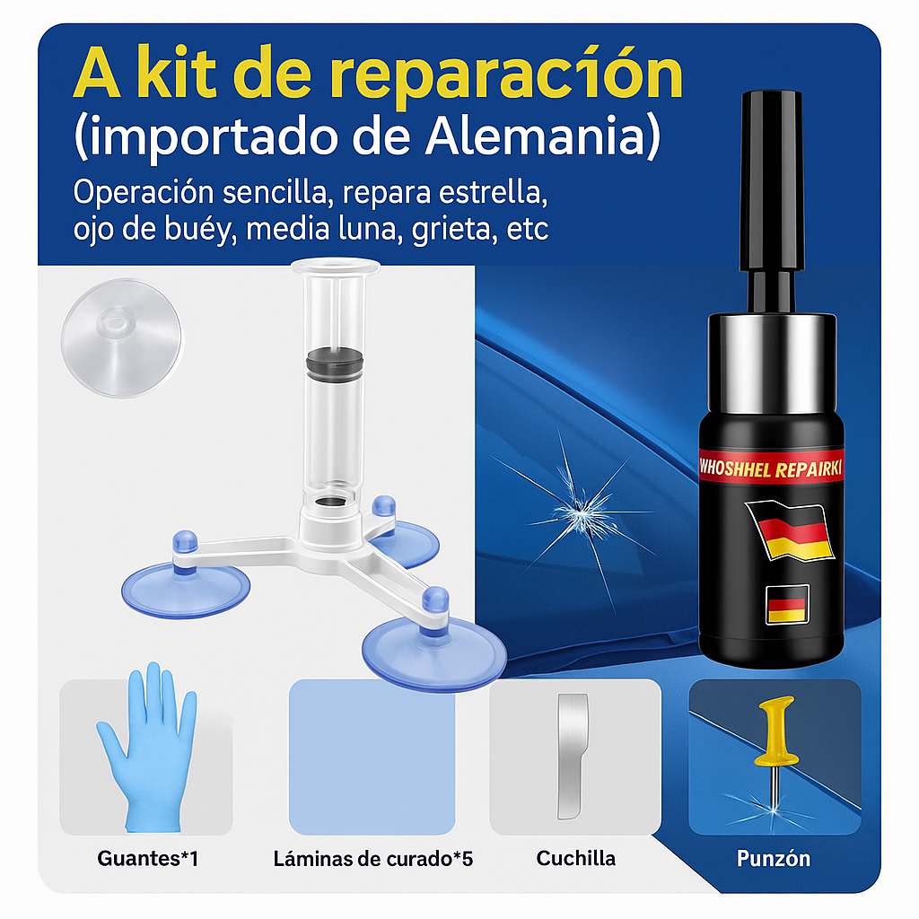Este kit de reparación de parabrisas contiene una resina líquida especial de alta penetración fabricada con componentes de silicona y polímeros avanzados importados de Alemania. Diseñado para restaurar la integridad del vidrio, ofrece alta transparencia, no se amarillea con el tiempo y es resistente a los cambios de temperatura.