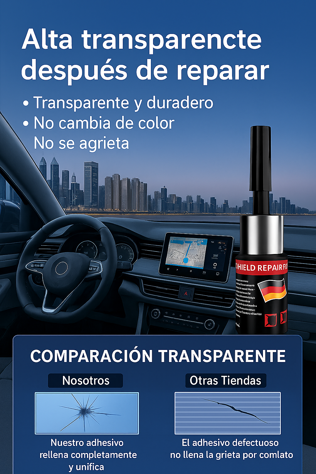 Adhesivo Reparador para Cristales Rotos de Coche – Reparación Rápida y Transparente