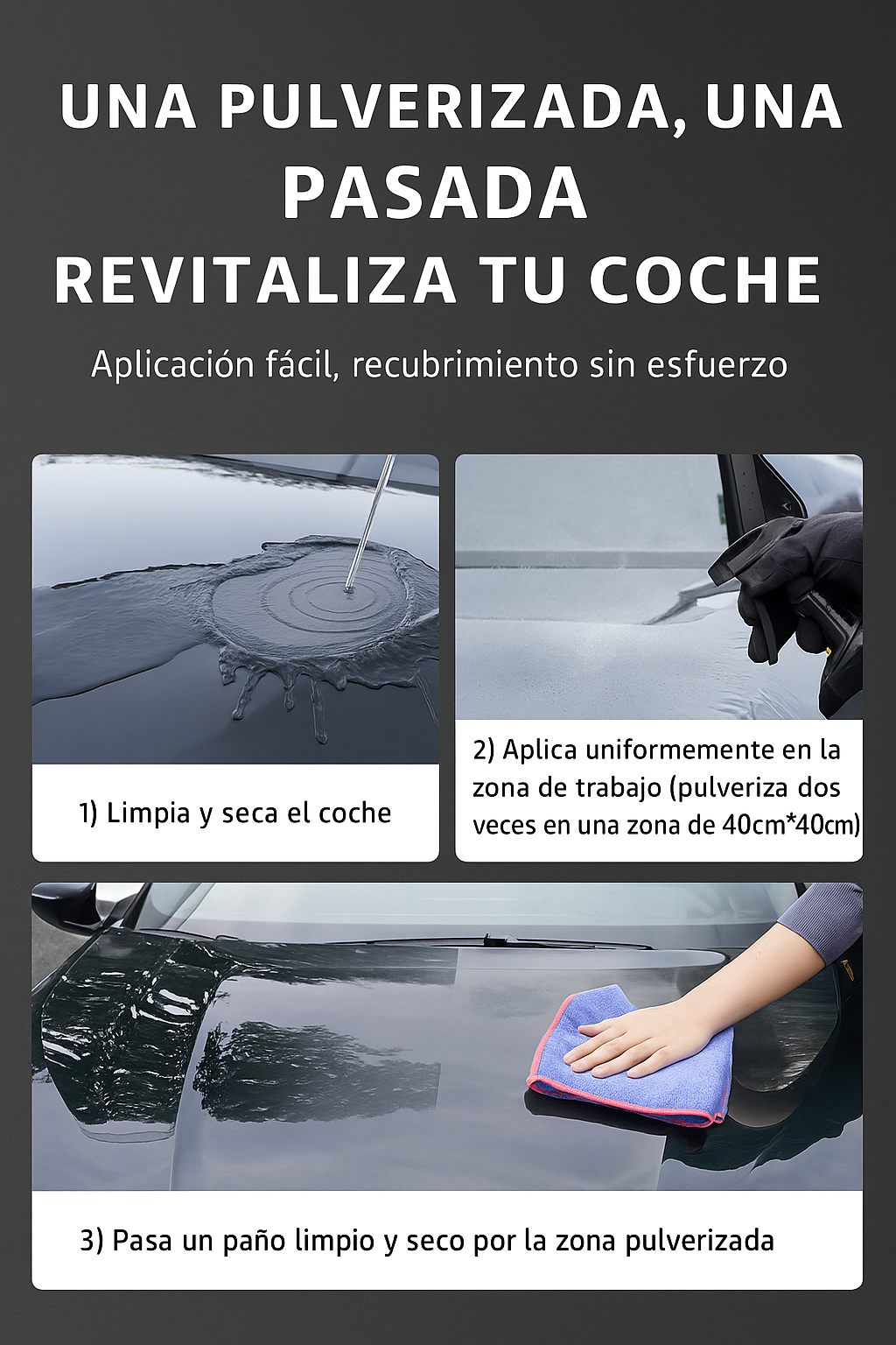 Gracias a su fórmula hidrofóbica de última generación, repele el agua y evita que el polvo y los residuos se adhieran a la superficie. Su uso es rápido y sencillo: solo pulveriza sobre la carrocería limpia y pasa un paño para activar una capa protectora duradera y de alto brillo.