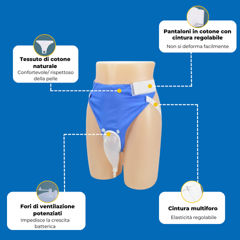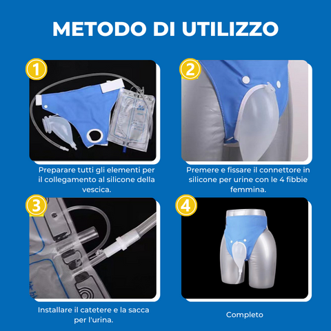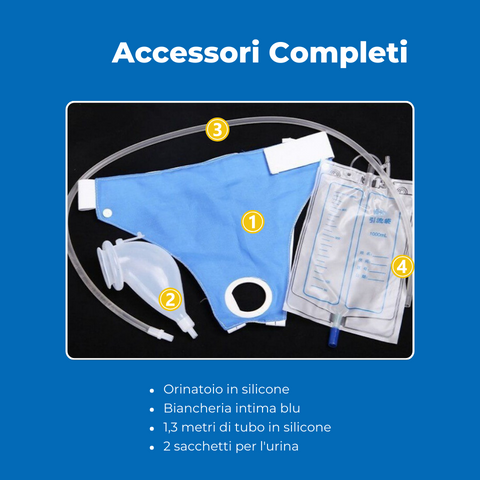 Accesorios incluidos: Urinario de silicona, ropa interior azul, 1,3 metros de tubo de silicona y 2 bolsas de orina