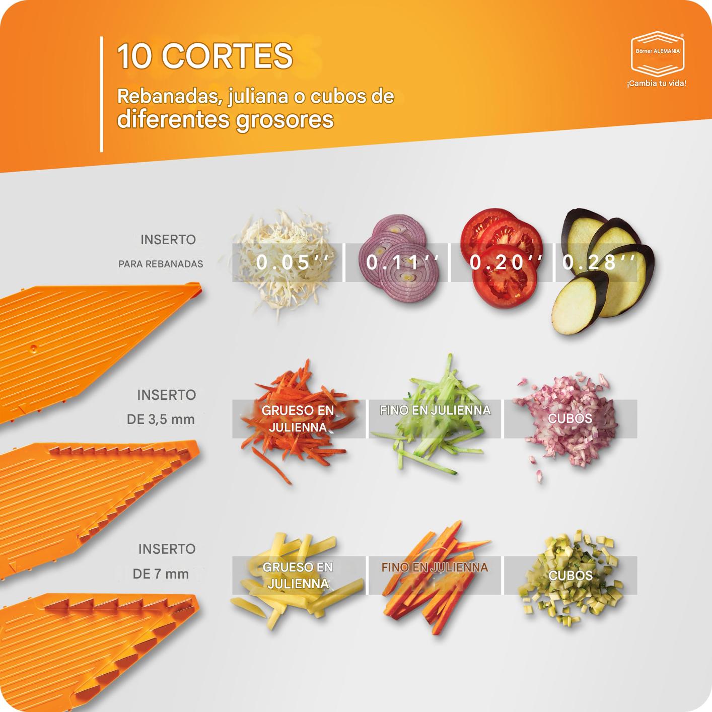 Ideal para ensaladas, sopas, guarniciones, preparación de frutas y más. Ahorra tiempo, mejora la presentación y cuida los nutrientes de cada platillo.
