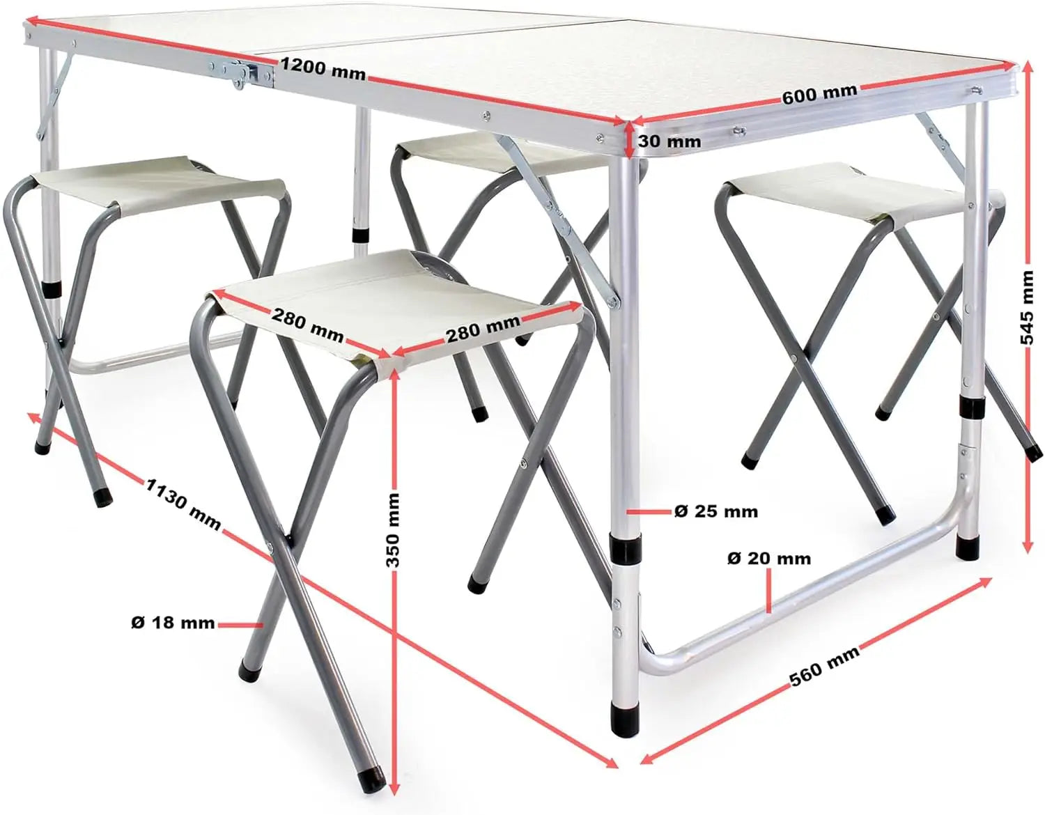 La mesa y los taburetes se pueden plegar fácilmente para ahorrar espacio. Los 4 taburetes se guardan dentro de la propia mesa, y gracias al asa integrada y su peso ligero, es muy fácil de transportar.