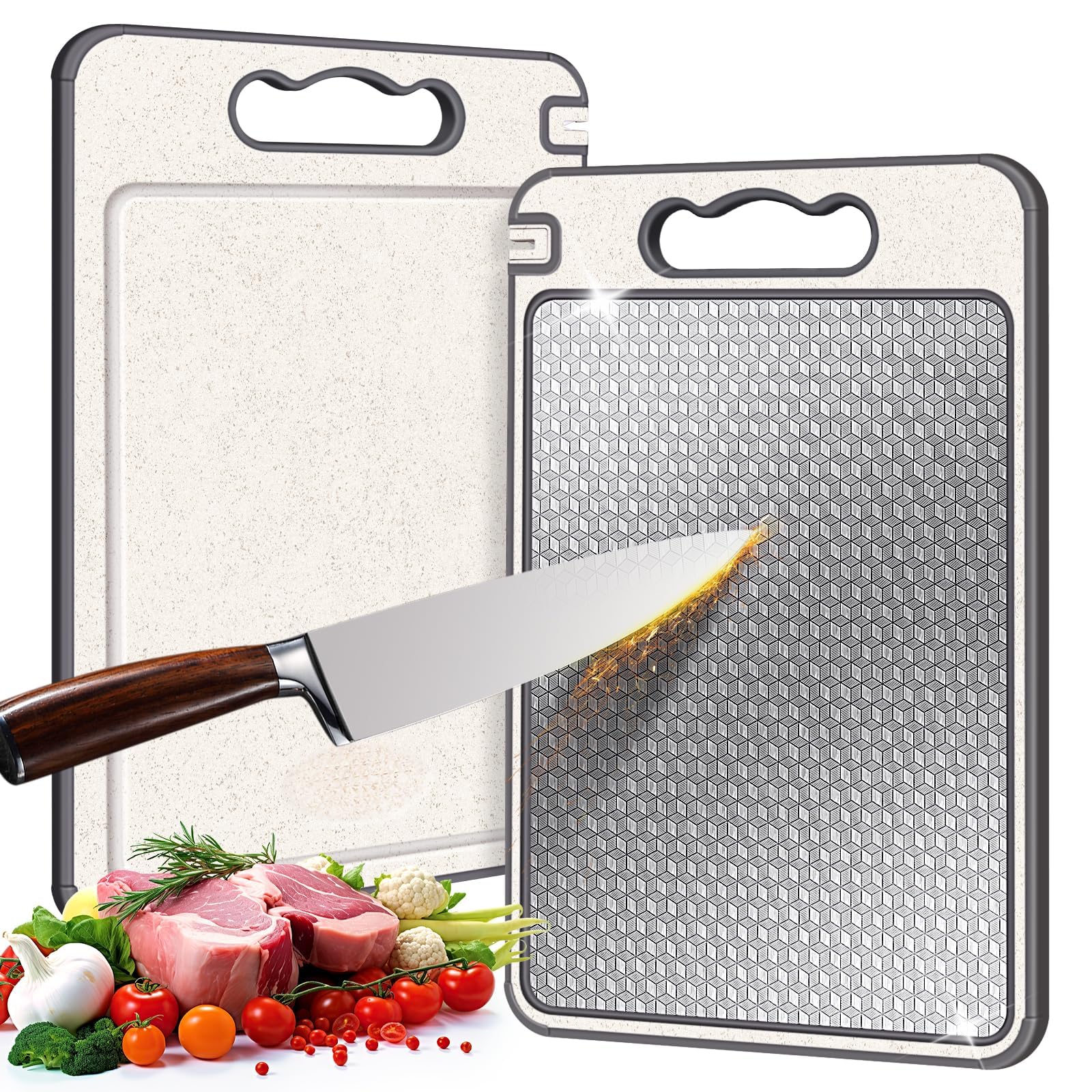 Un lado está hecho de acero inoxidable 304 de alta calidad para cortar carne cruda o cocida, y el otro lado está hecho de plástico de trigo sin BPA para cortar verduras. Ayuda a prevenir la contaminación cruzada, manteniendo las comidas seguras y sin olores.