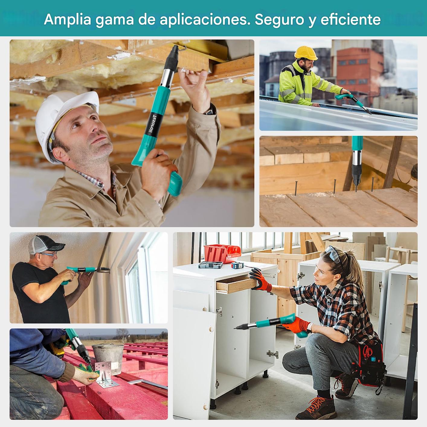 Solo necesitas gafas de seguridad, guantes y tapones para los oídos, elegir el clavo adecuado, colocar la pistola en ángulo recto y disparar. Su diseño mecánico seguro te permite trabajar de forma rápida incluso si es tu primera vez utilizándola.