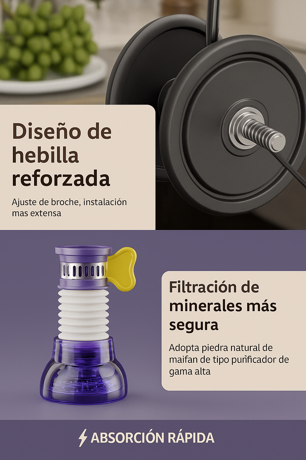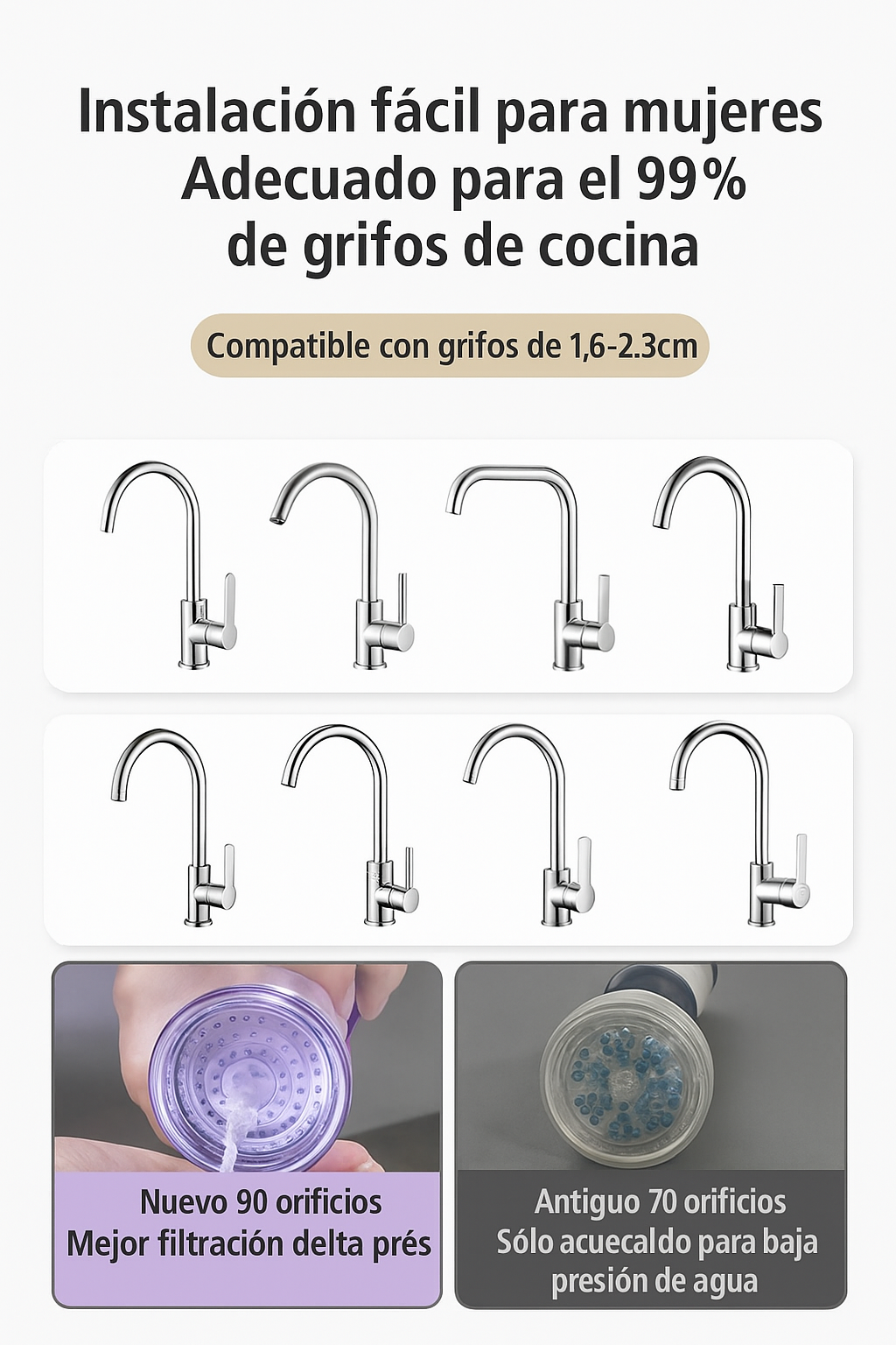 - Instalación Sencilla para Todos: Diseñado para una fácil instalación, compatible con el 99% de los grifos de cocina. Apto para grifos cilíndricos de 1.6-2.3 cm.