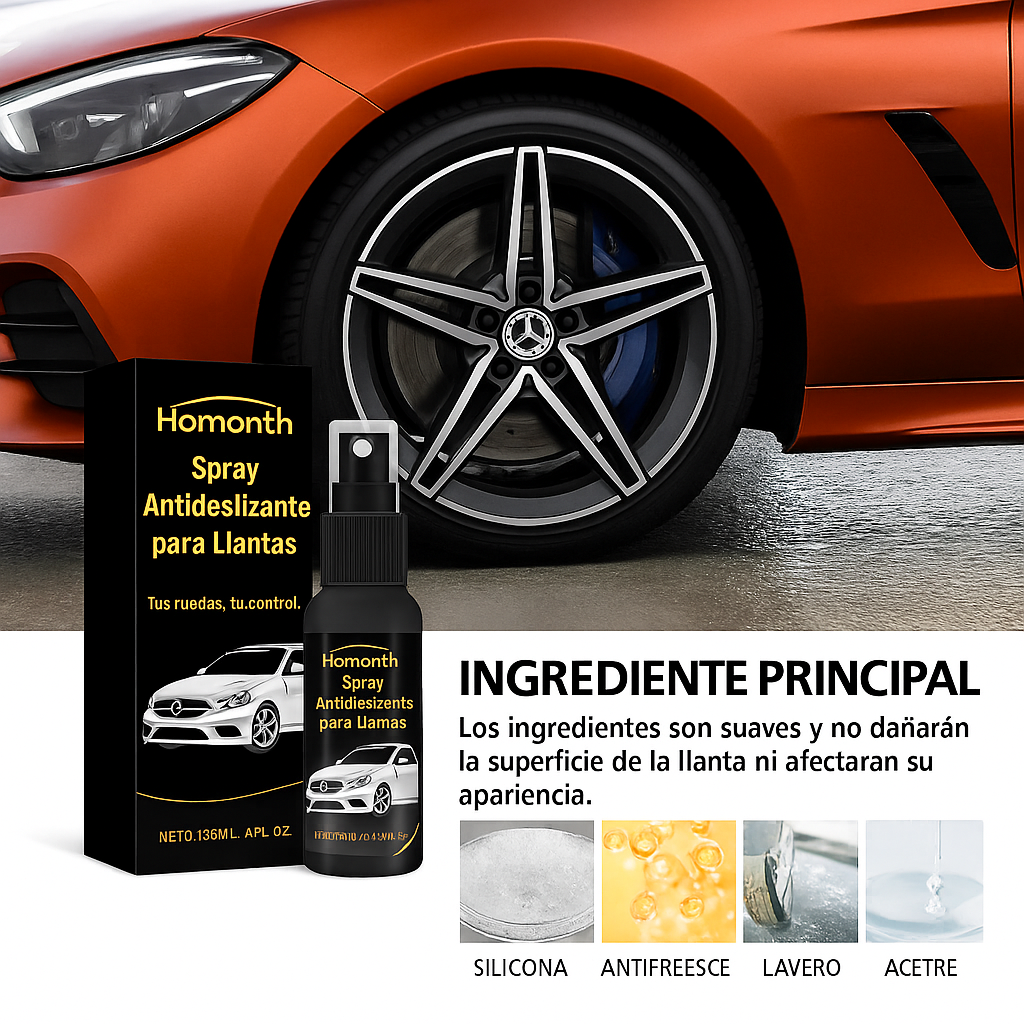 Mejora la tracción y seguridad de tus llantas con este spray antideslizante. Fácil de aplicar, resistente al agua y ideal para condiciones húmedas o nevadas.