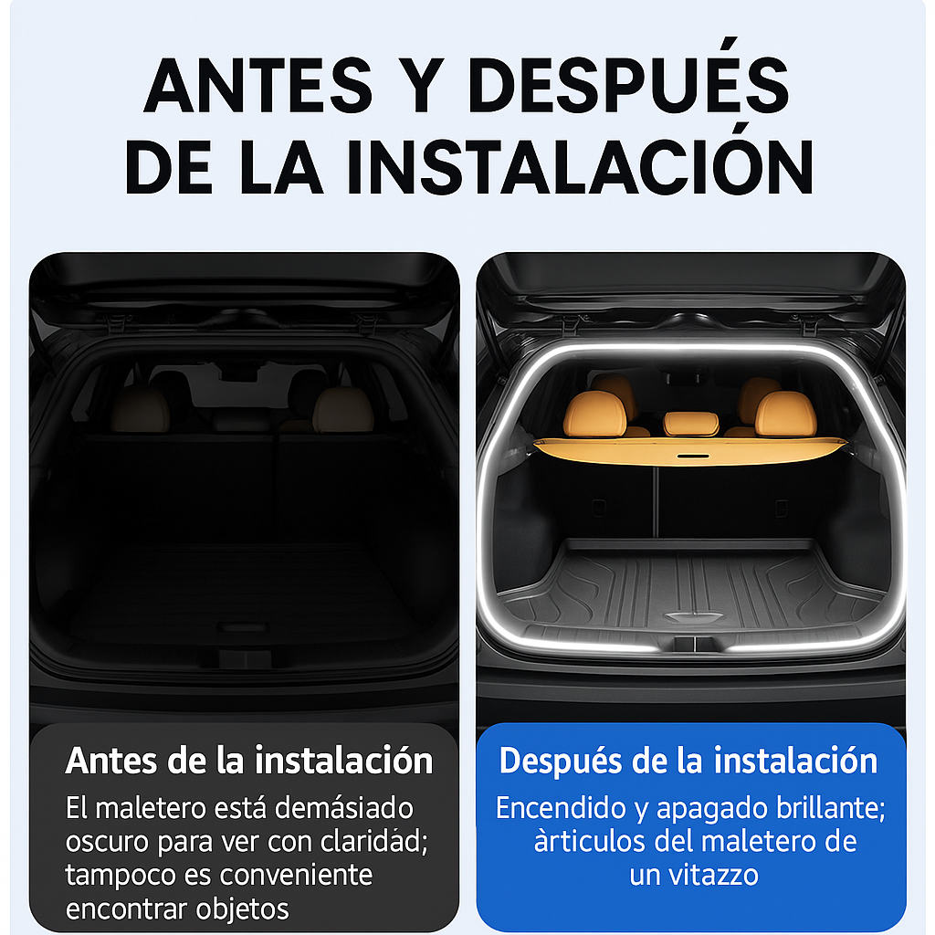 La luz se enciende automáticamente al abrir el maletero y se apaga al cerrarlo, sincronizada con la luz original del vehículo. No se enciende si no se abre la puerta.